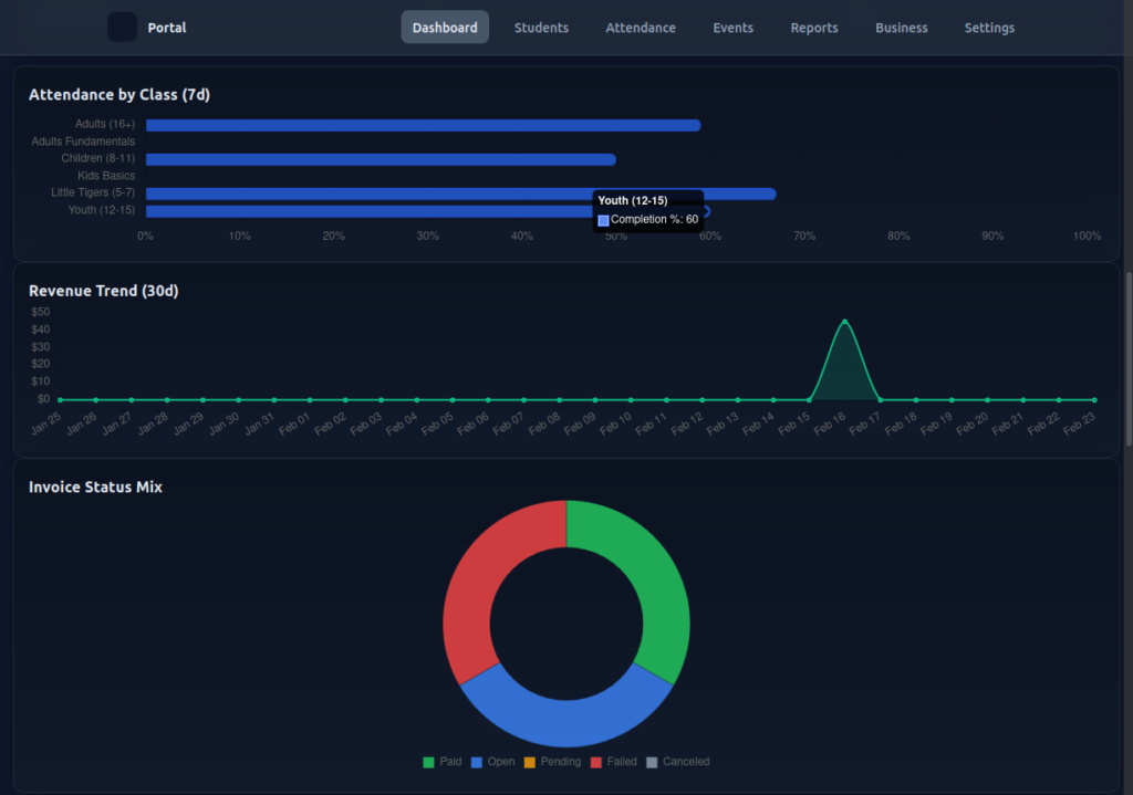 Owner and student portals, attendance, progression, billing routing, events, store, and marketing tools in one operating system.