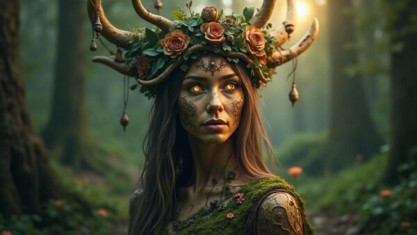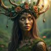 Beytom appears as a great queen of living wood and stone, crowned with vines and flowers. On this tile, her spiral sigil of foundation calls in prosperity, fertility, and endurance—soil for projects, homes, and legacies that last.